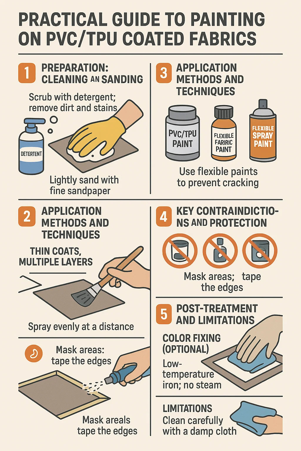 Seo treoir phraiticiúil maidir le péinteáil ar Fabraicí brataithe PVC agus fabraicí brataithe TPU, lena n-ionchorpraítear comheispéireas oibriúcháin agus réamhchúraimí: