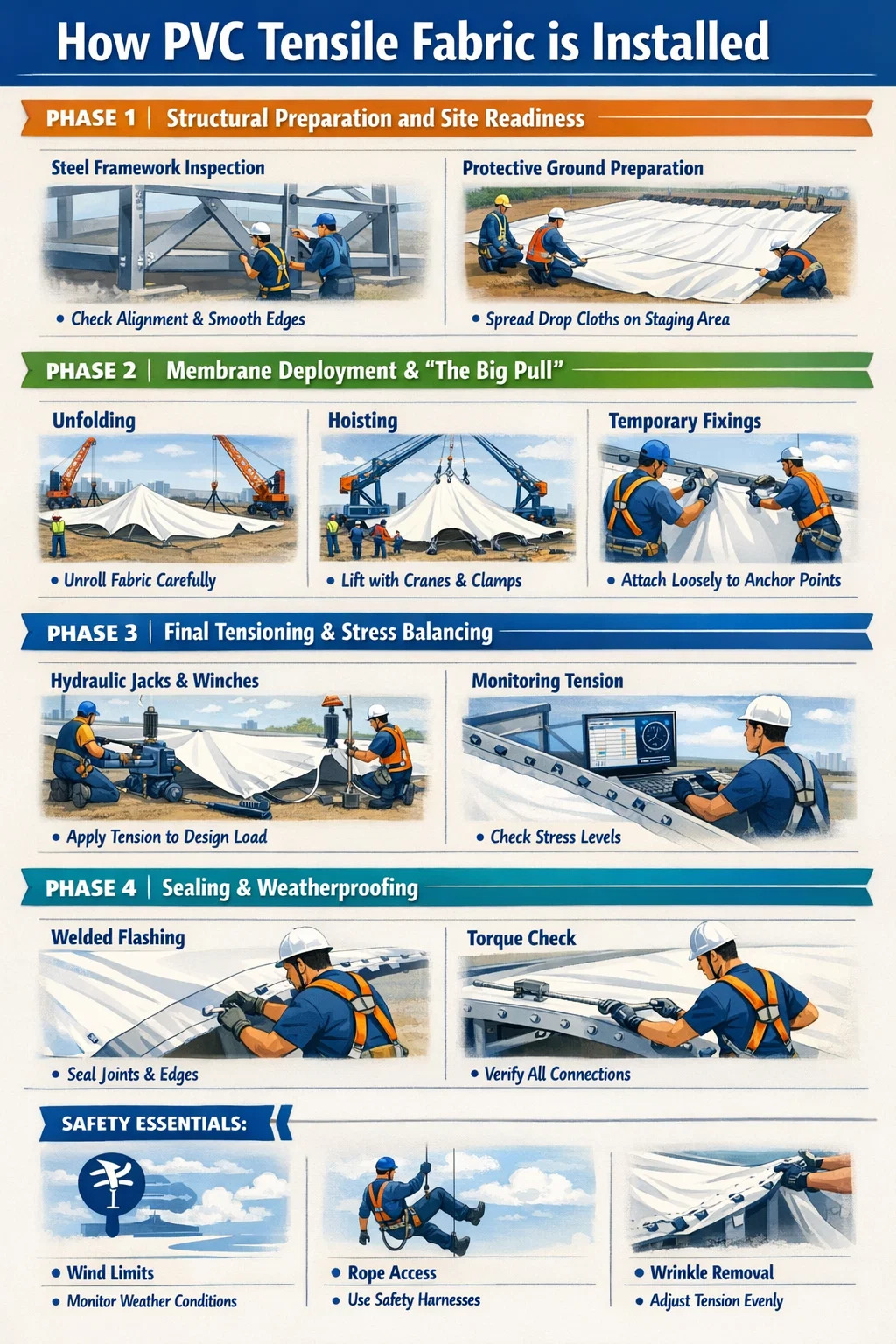 A Fabraic teanntachta PVC Níl struchtúr ach "struchtúrtha" nuair a bhíonn sé faoi teannas. Gan teannas cuí, bheadh an fabraic flap sa ghaoth, rud a chuirfeadh tuirse agus teip sa deireadh. Is éard atá i gceist leis an gcéim seo ná an fabraic a tharraingt chuig a leibhéil réamh-strus , de ghnáth ag réimsiú ó 1.0 go 5.0 kN/m ag brath ar na riachtanais innealtóireachta.