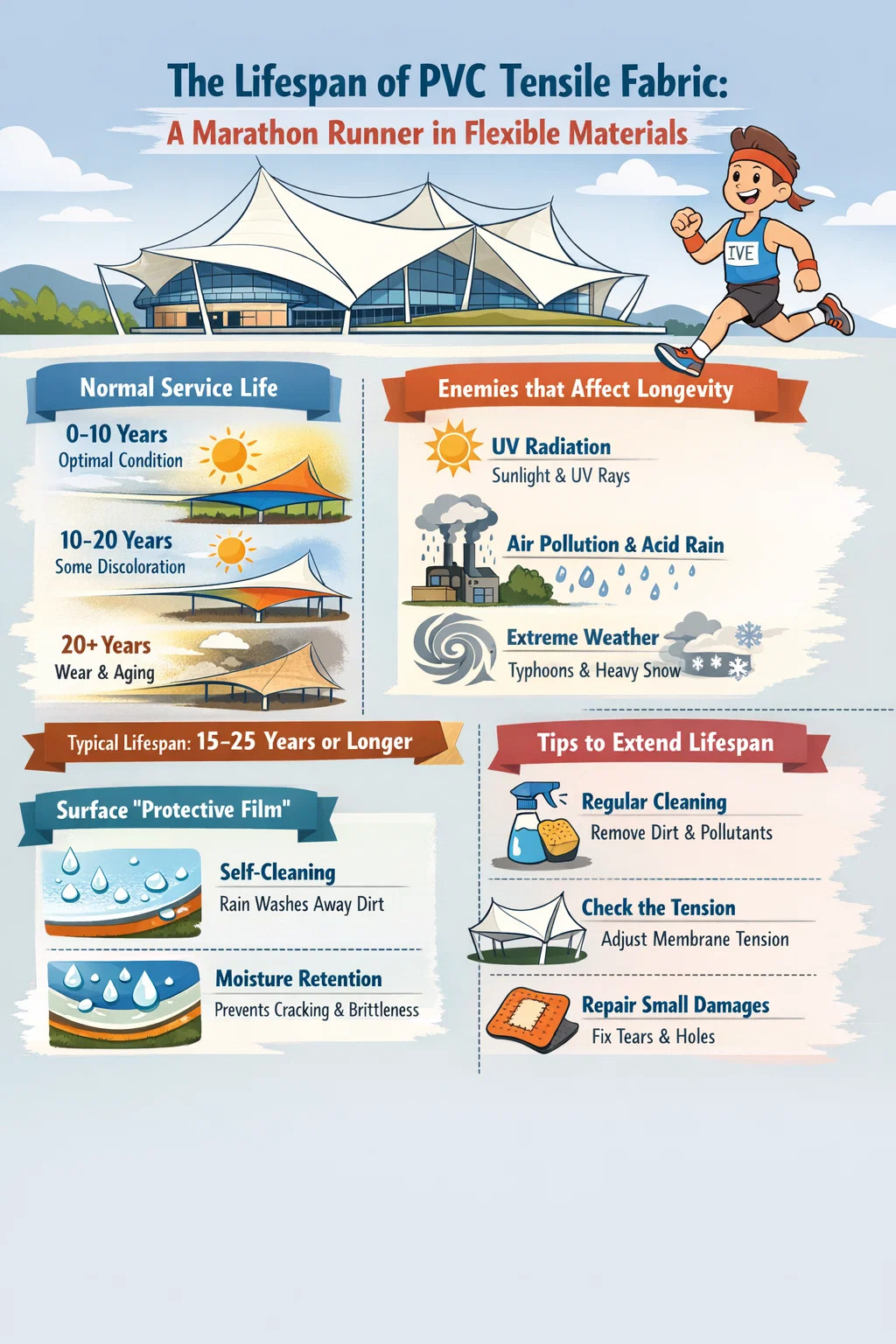 Maidir le saolré na Fabraic teanntachta PVC , go simplí, tá sé cosúil le "blaosc" ardteicneolaíochta is féidir a bheith ag gabháil le foirgneamh ar feadh tréimhse fada. Cé go bhféadfadh sé nach mairfidh sé céad bliain cosúil le brící agus tíleanna, is cinnte gur "rádala marathon" fada buan é i saol na n-ábhar solúbtha.
